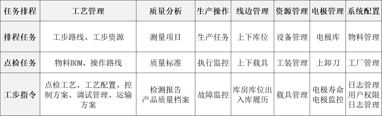 智能柔性生產管理系統是智能產線的大腦,通過柔性工藝配置對產品、機床、測量設備、電極、工裝夾具、線邊庫等進行協同管控。其?向上對接?MES/ERP?系統進行計劃的同步,向下對接設備層實現程序下發、設備控制、數采監控,對刀換刀等功能。